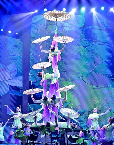 10月25日,在北京二七剧场举行的“艺苑撷英——2025年全国优秀青年艺术人才展演”上,德州市杂技团演员表演杂技《荷塘月色——蹬伞》。新华社记者 才扬摄